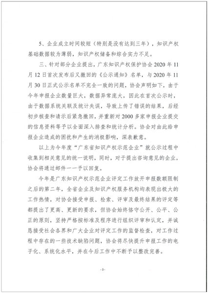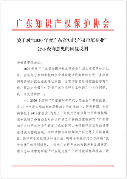 关于对“2020年度广东省知识产权示范企业”公示查询意见的回复说明