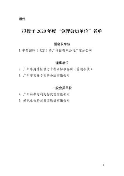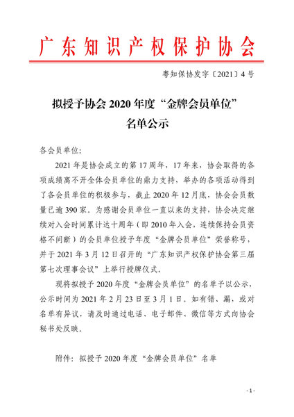 粤知保协发字〔2021〕4号-拟授予协会2020年度“金牌会员单位”名单公示