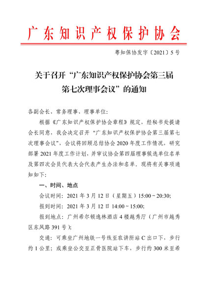 粤知保协发字〔2021〕5号-关于召开“广东知识产权保护协会第三届第七次理事会议”的通知