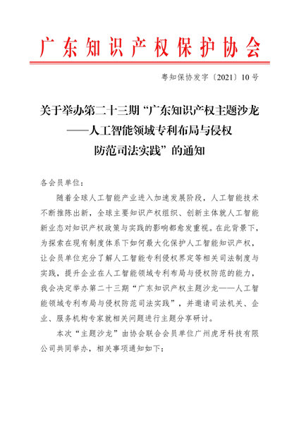 粤知保协发字〔2021〕10号-关于举办第二十三期“广东知识产权主题沙龙——人工智能领域专利布局与侵权防范司法实践“的通知