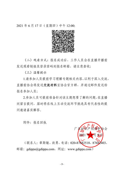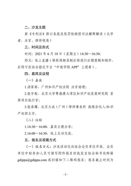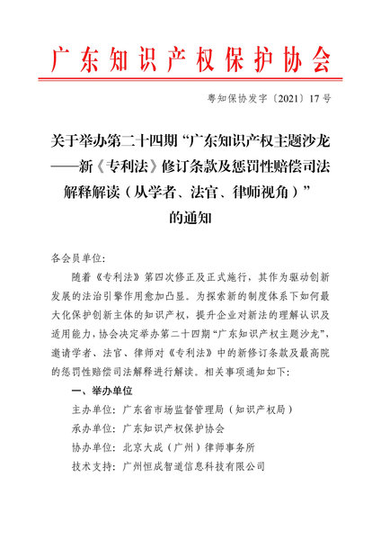 粤知保协发字〔2021〕17号-关于举办第二十四期“广东知识产权主题沙龙——新《专利法》修订条款及惩罚性赔偿司法解释解读(从学者、法官、律师视角)”的通知