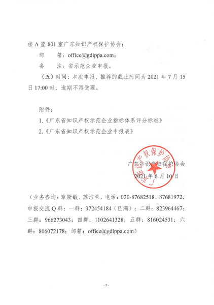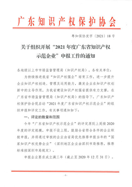 通知文件:粤知保协发字〔2021〕18号-关于组织开展“2021年度广东省知识产权示范企业”申报工作的通知