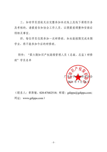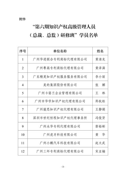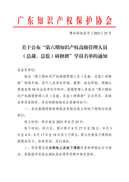 粤知保协发字〔2021〕25号-关于公布“第六期知识产权高级管理人员(总裁、总监)研修班”学员名单的通知