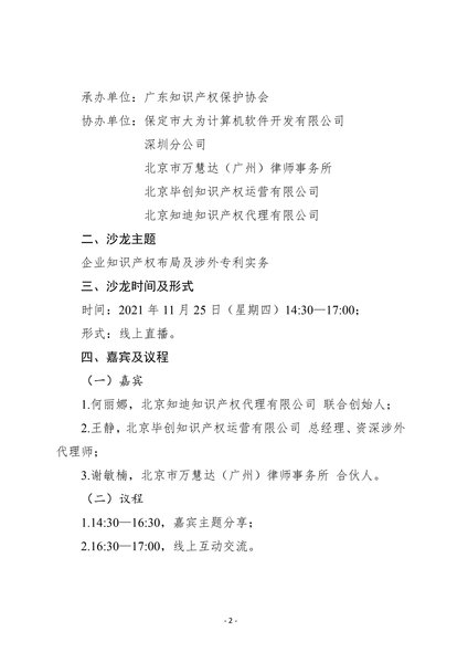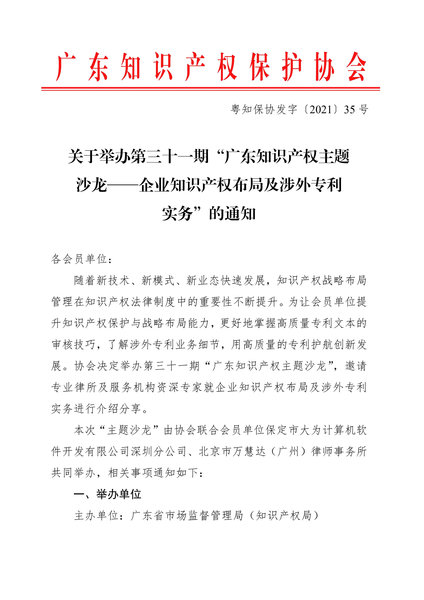 粤知保协发字〔2021〕35号-关于举办第三十一期“广东知识产权主题沙龙——企业知识产权布局及涉外专利实务”的通知