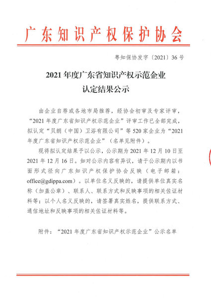 粤知保协发字〔2021〕36号-2021年度广东省知识产权示范企业认定结果公示