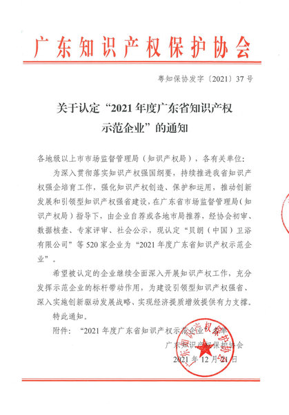 粤知保协发字〔2021〕37号-关于认定“2021年度广东省知识产权示范企业“的通知