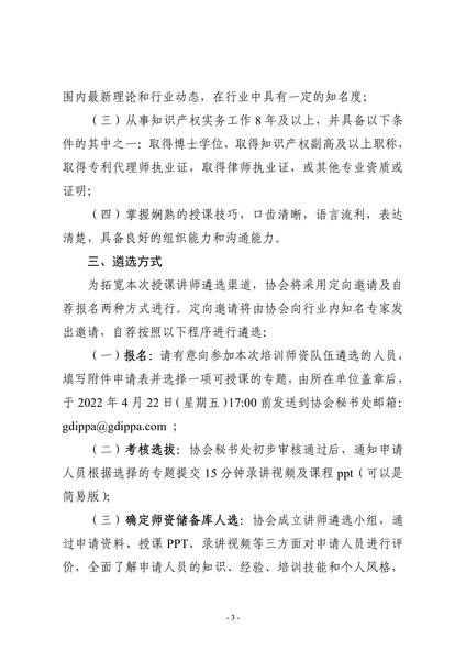 粤知保协发字〔2022〕10号-关于遴选广东省企业知识产权高管人才培育项目授课讲师的通知