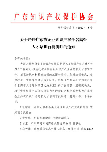 粤知保协发字〔2022〕15号-关于聘任广东省企业知识产权千名高管人才培训首批讲师的通知