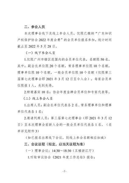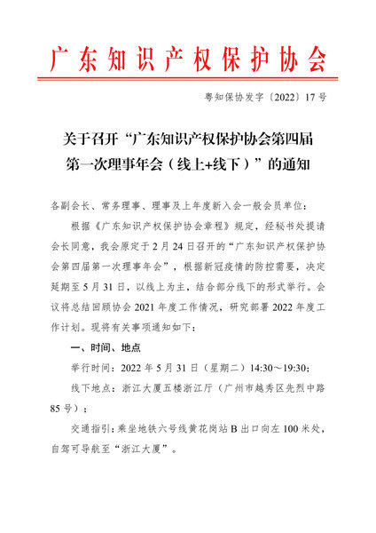 粤知保协发字〔2022〕17号-关于召开“广东知识产权保护协会第四届第一次理事年会(线上+线下)”的通知