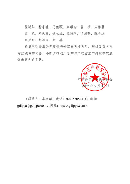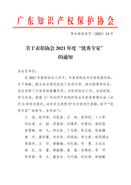 粤知保协发字〔2022〕24号-关于表彰协会2021年度“优秀专家”的通知