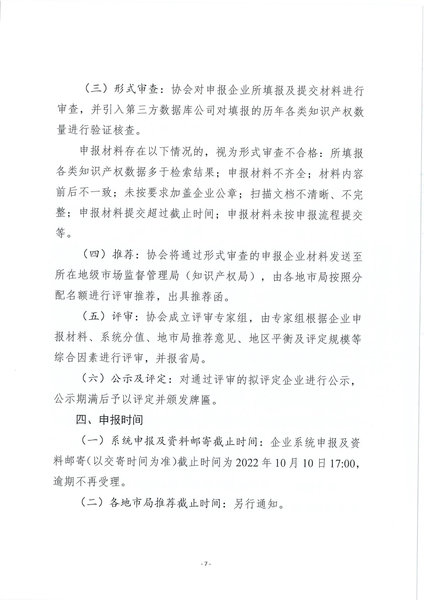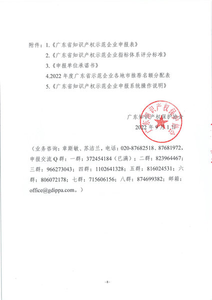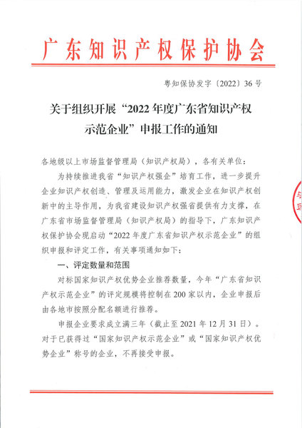 通知正文:粤知保协发字〔2022〕36号-关于组织开展“2022年度广东省知识产权示范企业”申报工作的通知