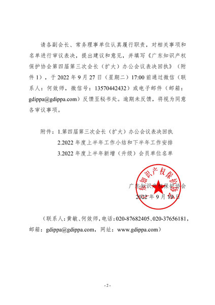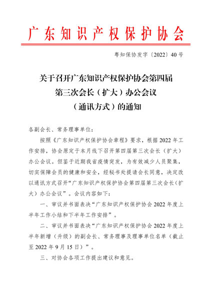 粤知保协发字〔2022〕40号-关于召开广东知识产权保护协会第四届第三次会长(扩大)办公会议(通讯方式)的通知