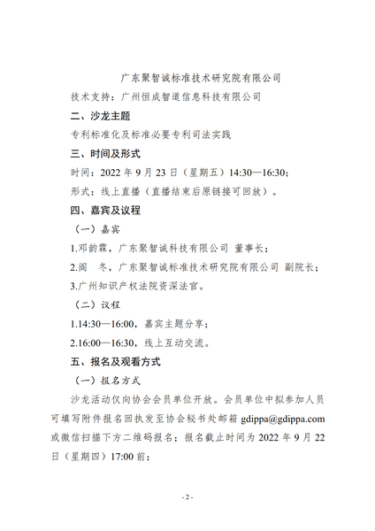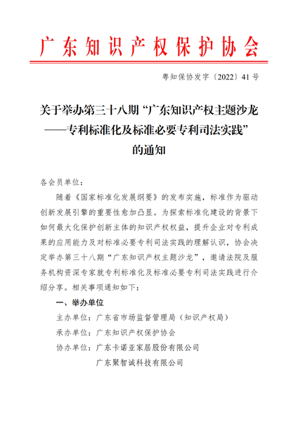 粤知保协发字〔2022〕41号-关于举办第三十八期“广东知识产权主题沙龙——专利标准化及标准必要专利司法实践”的通知