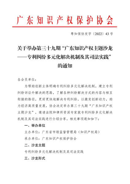 粤知保协发字〔2022〕43号-关于举办第三十九期“广东知识产权主题沙龙——专利纠纷多元化解决机制及其司法实践”的通知