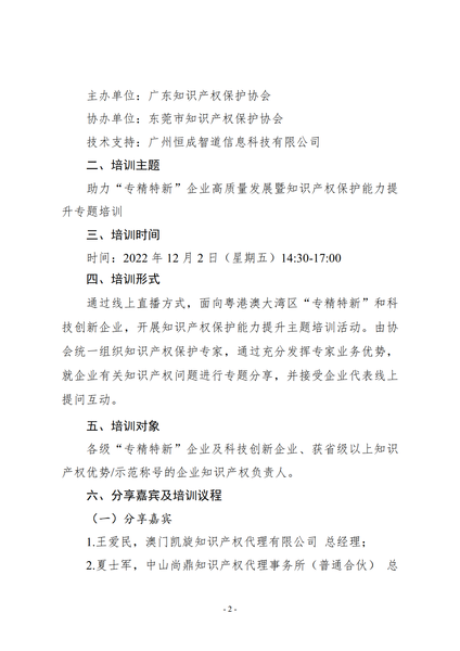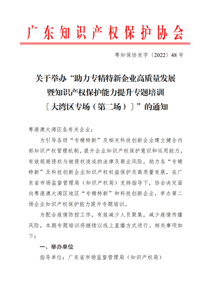 粤知保协发字〔2022〕48号-关于举办“助力专精特新企业高质量发展暨知识产权保护能力提升专题培训〔大湾区专场(第二场)〕”的通知