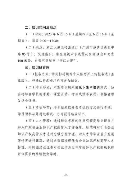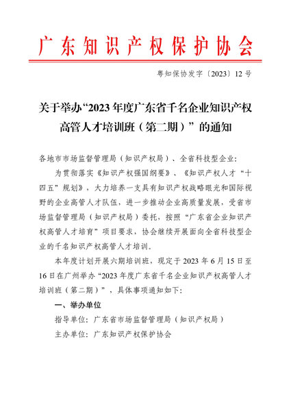 粤知保协发字〔2023〕12号-关于举办“2023年度广东省千名企业知识产权高管人才培训班(第二期)”的通知