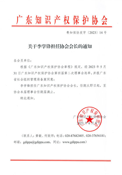 粤知保协发字〔2023〕14号-关于李学锋担任协会会长的通知