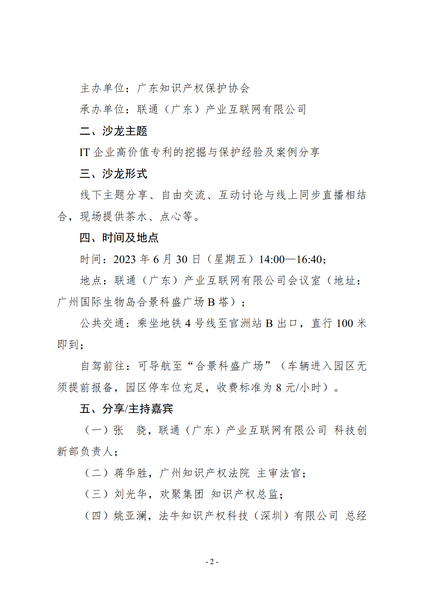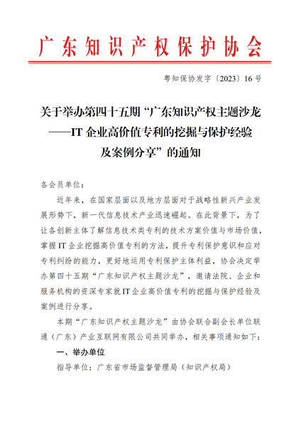 粤知保协发字〔2023〕16号-关于举办第四十五期“广东知识产权主题沙龙——IT企业高价值专利的挖掘与保护经验及案例分享”的通知