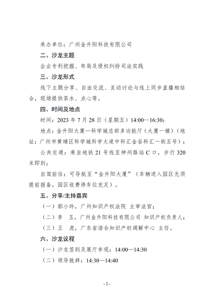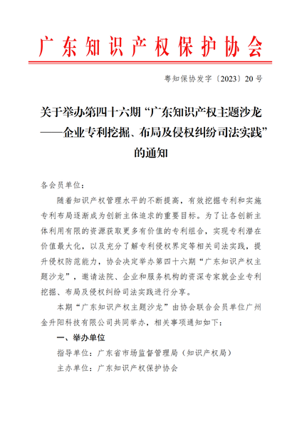 粤知保协发字〔2023〕20号-关于举办第四十六期“广东知识产权主题沙龙——企业专利挖掘、布局及侵权纠纷司法实践”的通知