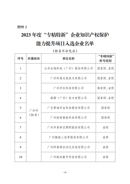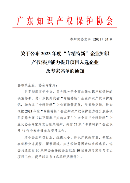 粤知保协发字〔2023〕24号-关于公布2023年度“专精特新”企业知识产权保护能力提升项目入选企业及专家名单的通知