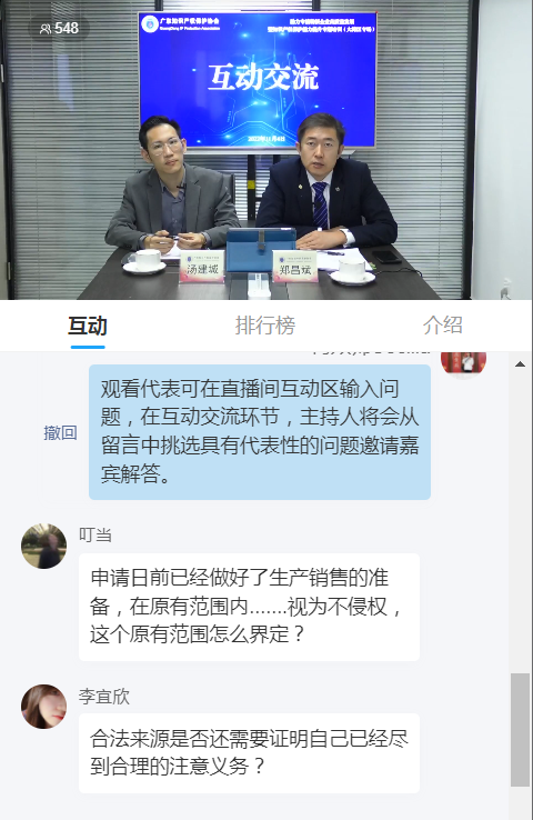 互动交流环节,观看直播代表通过线上讨论区与三位专家就“商业秘密分级保护”“专利先用权抗辩”“商标跨类保护”等相关问题进行讨论和交流。
