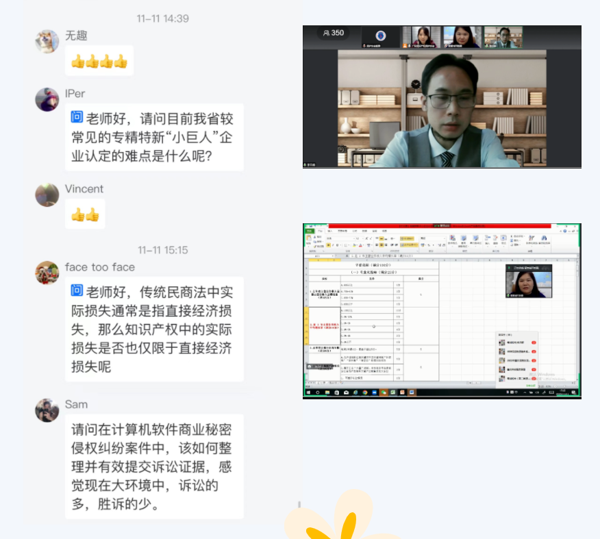 互动交流环节,观看直播代表通过线上讨论区与专家就“专精企业认定难点”“赔偿损失认定”“计算机软件侵权纠纷中证据提交”等相关问题进行讨论和交流。