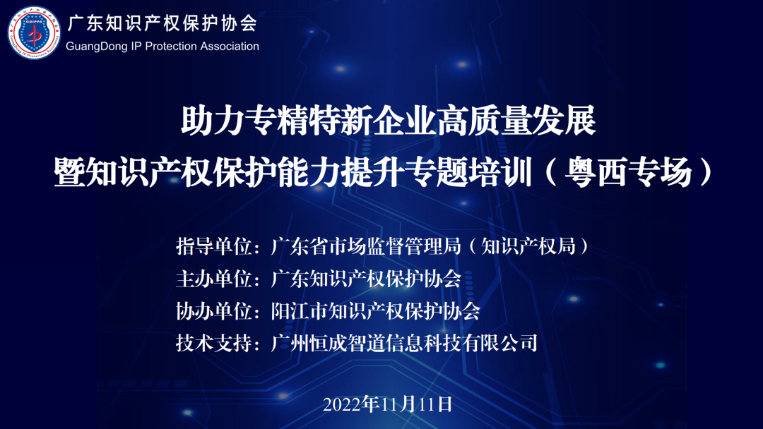 2022年11月11日下午,“助力专精特新企业高质量发展暨知识产权保护能力提升专题培训(粤西专场)”顺利举行。培训活动邀请了广东聚智诚科技有限公司董事长邓韵霖、北京市隆安(广州)律师事务所高级合伙人吴让军以及湖南旷真(深圳)律师事务所专业管理部部长李日彪为粤西地区“专精特新”和科技创新企业分享授课。