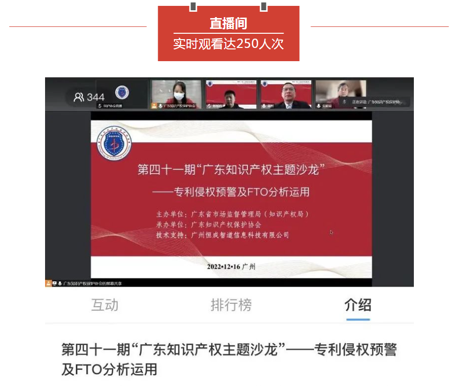 协会会员单位及相关单位知识产权人员超250人次观看了实时直播节目,直播平台有回放功能,目前观看达340人次。
