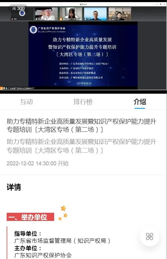 粤港澳大湾区“专精特新”和科技创新企业及相关单位知识产权人员超275人次观看了实时直播节目,直播平台有回放功能,目前观看达300人次。
