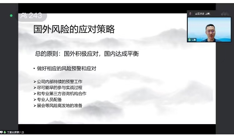 王鹏顾问结合多年的企业实务工作经验,从专利预警分析、布局质量、国外代理机构的选择、国外专利成本控制几个方面为企业应对海外知识产权风险提供建议。