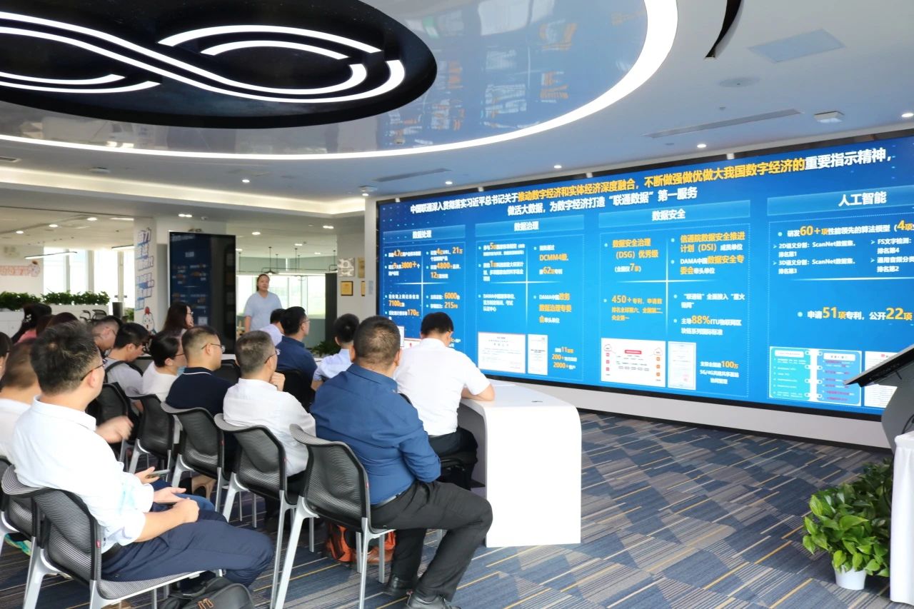 在联通(广东)产业互联网有限公司科技创新部负责人张骁带领下,参会代表参观联通产互公司的展厅,了解公司概况及业务范围。