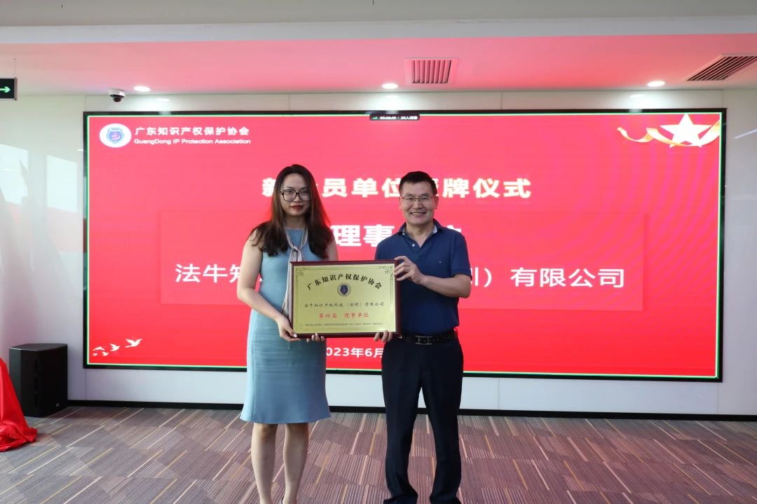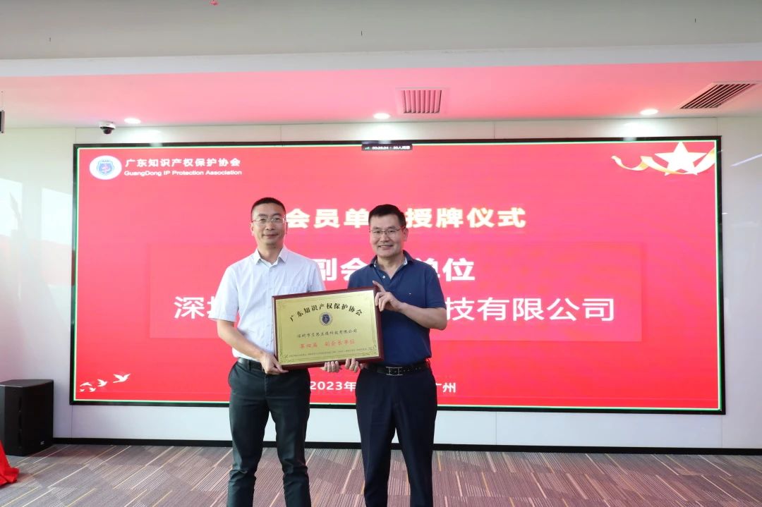 协会李学锋会长为新入会会员单位深圳市贝思兰德科技有限公司、法牛知识产权科技(深圳)有限公司以及中山市科创专利代理有限公司代表颁发会员牌匾。