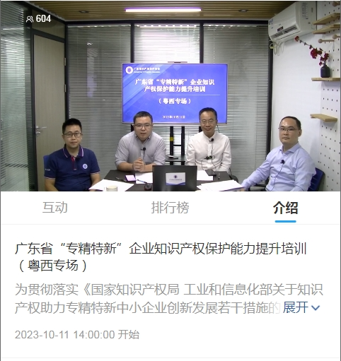 粤西地区“专精特新”和科技创新企业及相关单位知识产权人员502人次观看了实时直播节目,直播平台有回放功能,目前观看达604人次。