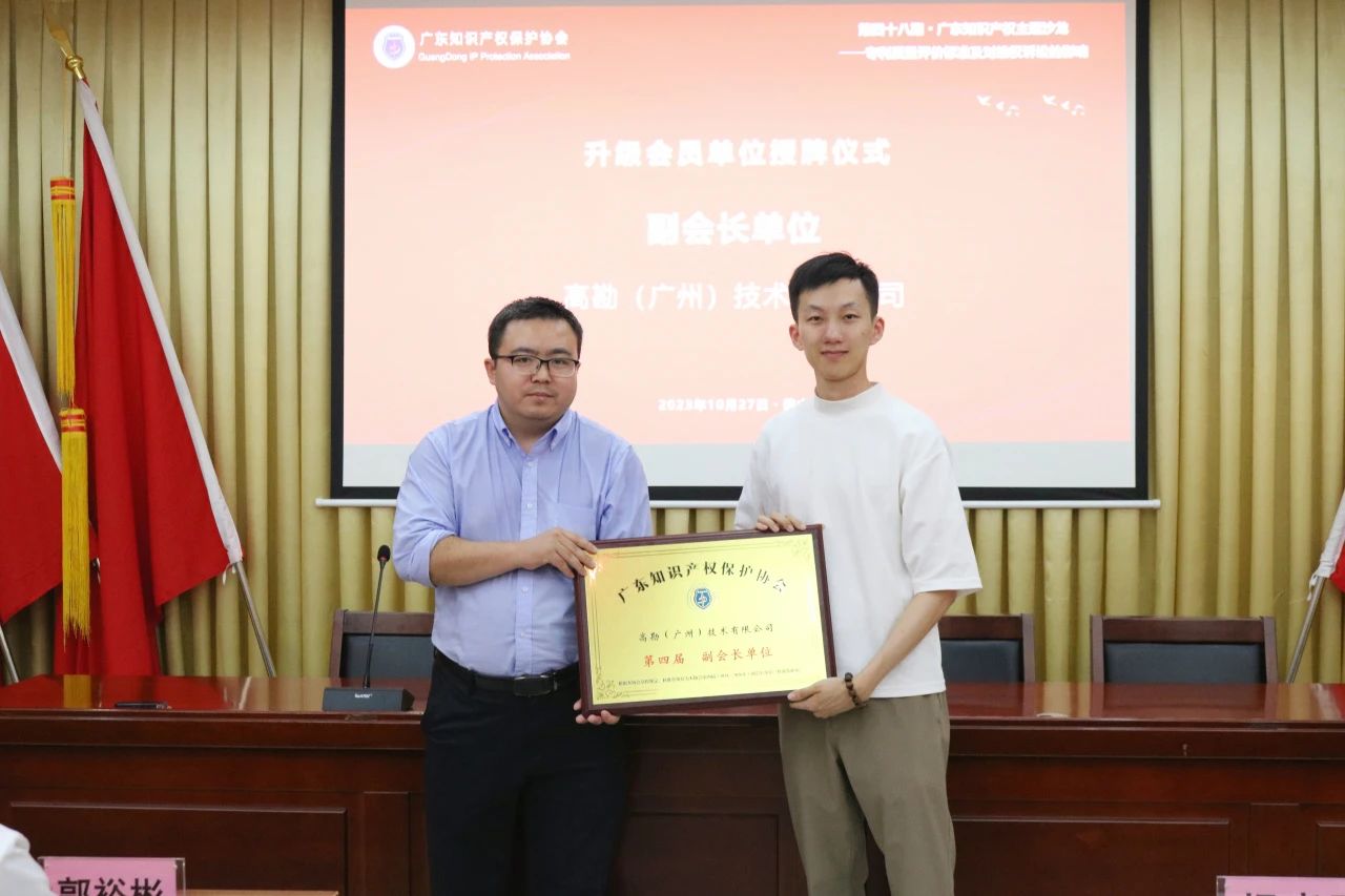 尚勇副秘书长为升级副会长单位高勘(广州)技术有限公司,新入会一般会员单位惠州市知识产权协会代表颁牌。