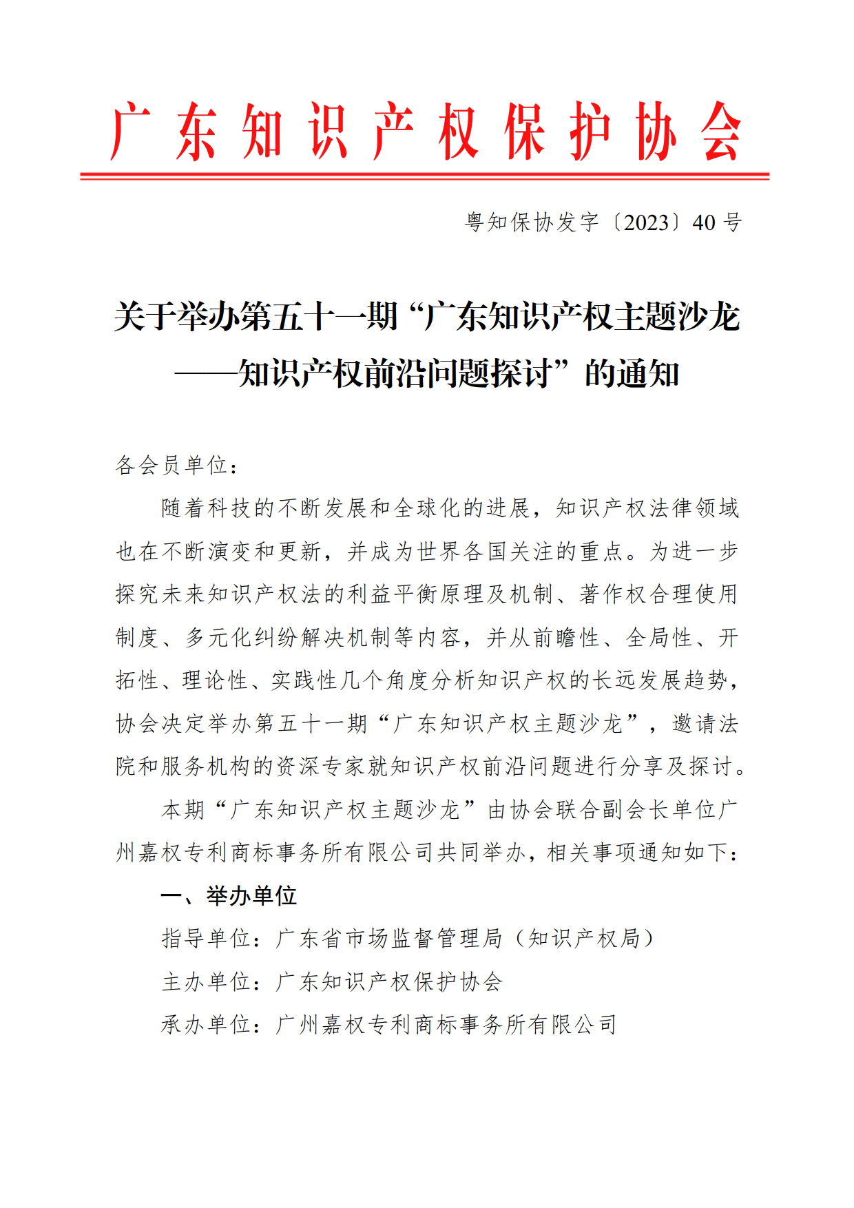 粤知保协发字〔2023〕40号-关于举办第五十一期“广东知识产权主题沙龙——知识产权前沿问题探讨”的通知