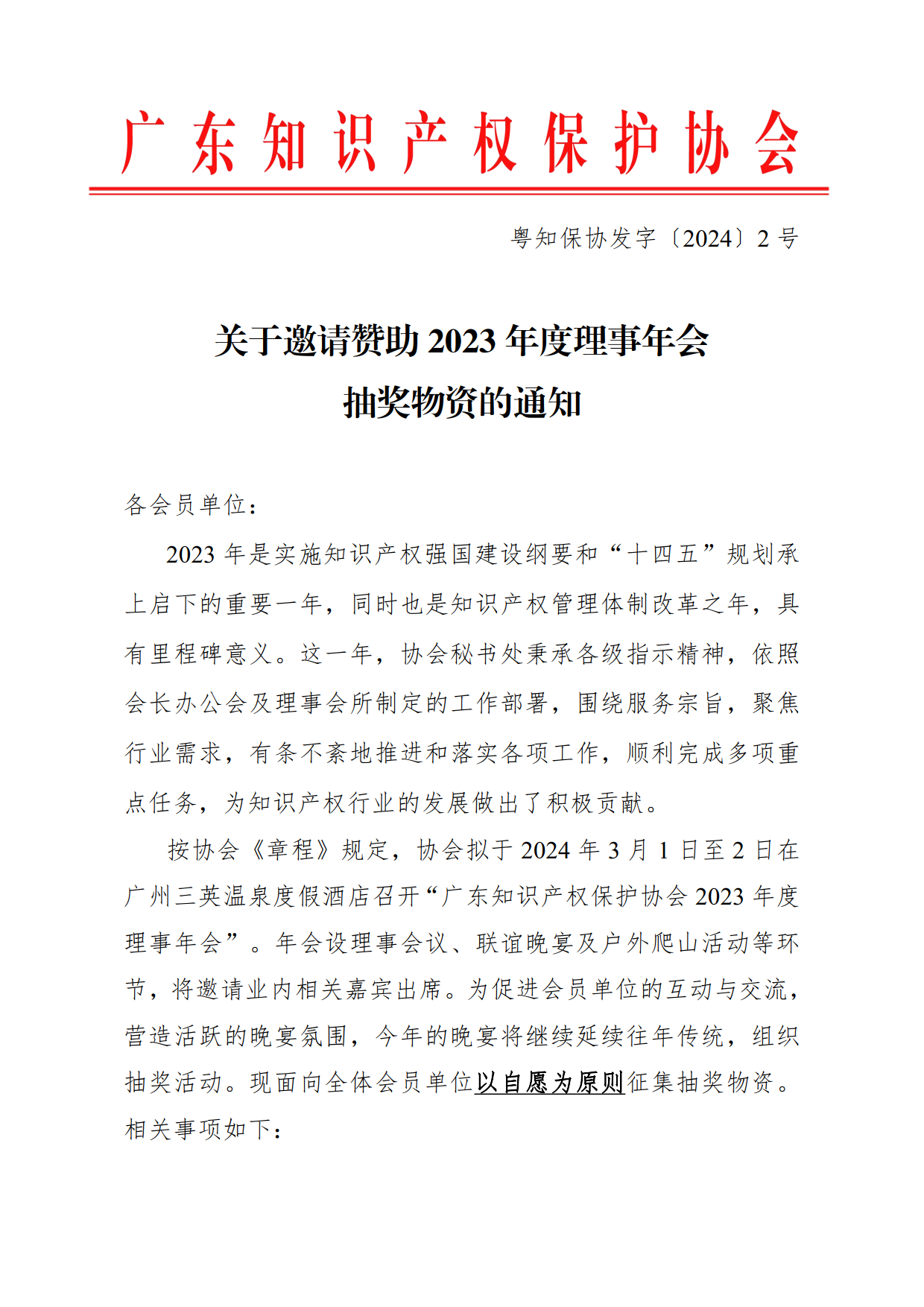 粤知保协发字〔2024〕2号-关于邀请赞助2023年度理事年会抽奖物资的通知