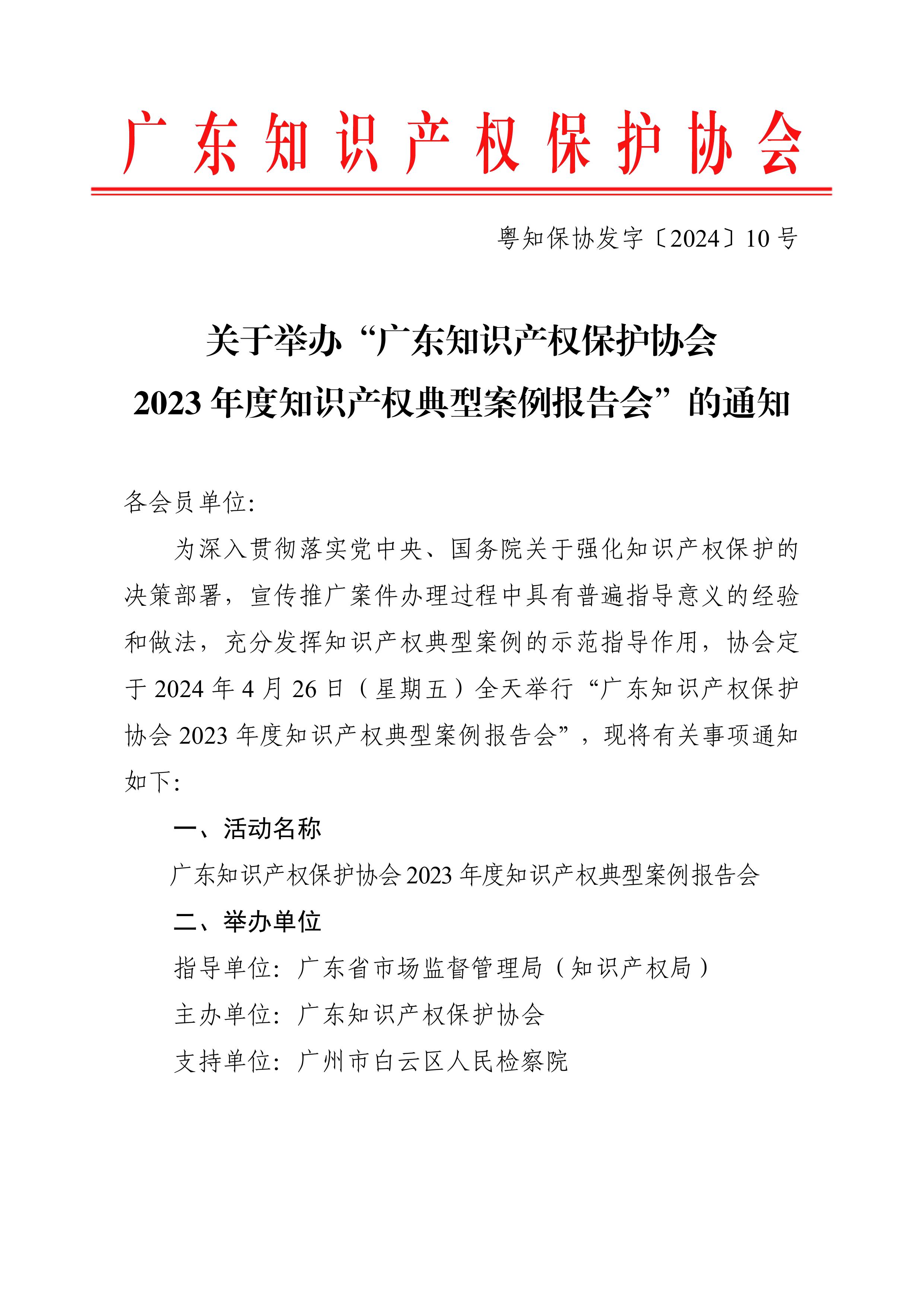 粤知保协发字〔2024〕10号-关于举办“广东知识产权保护协会2023年度知识产权典型案例报告会”的通知