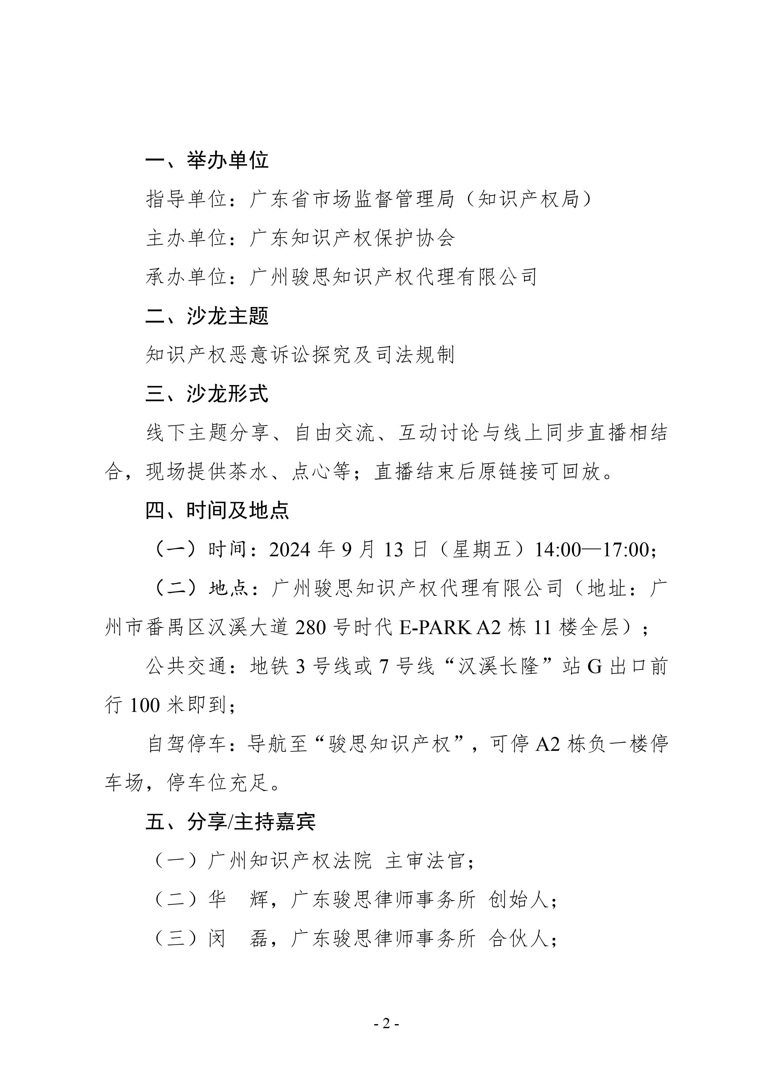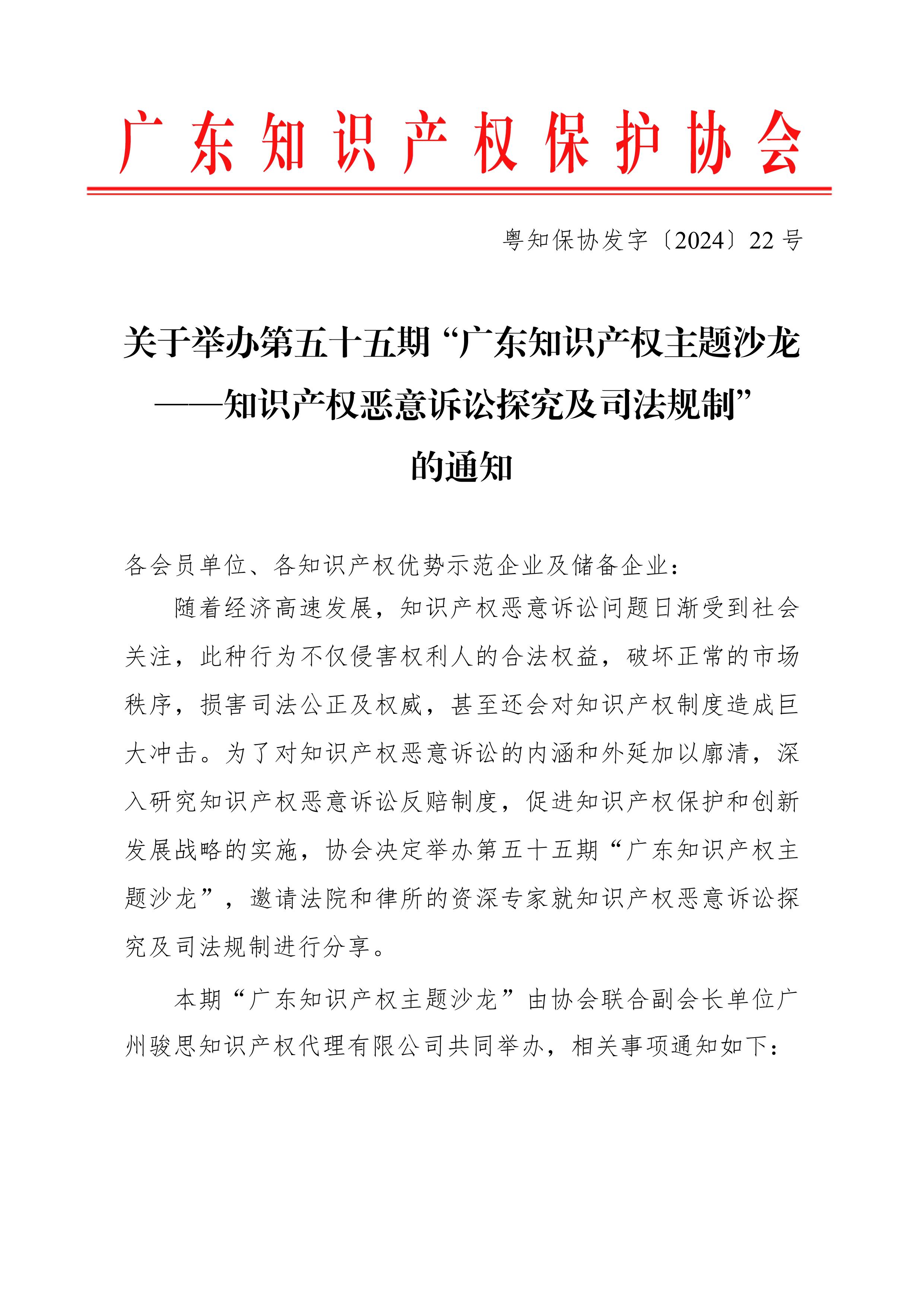 粤知保协发字〔2024〕22号-关于举办第五十五期“广东知识产权主题沙龙——知识产权恶意诉讼探究及司法规制”的通知
