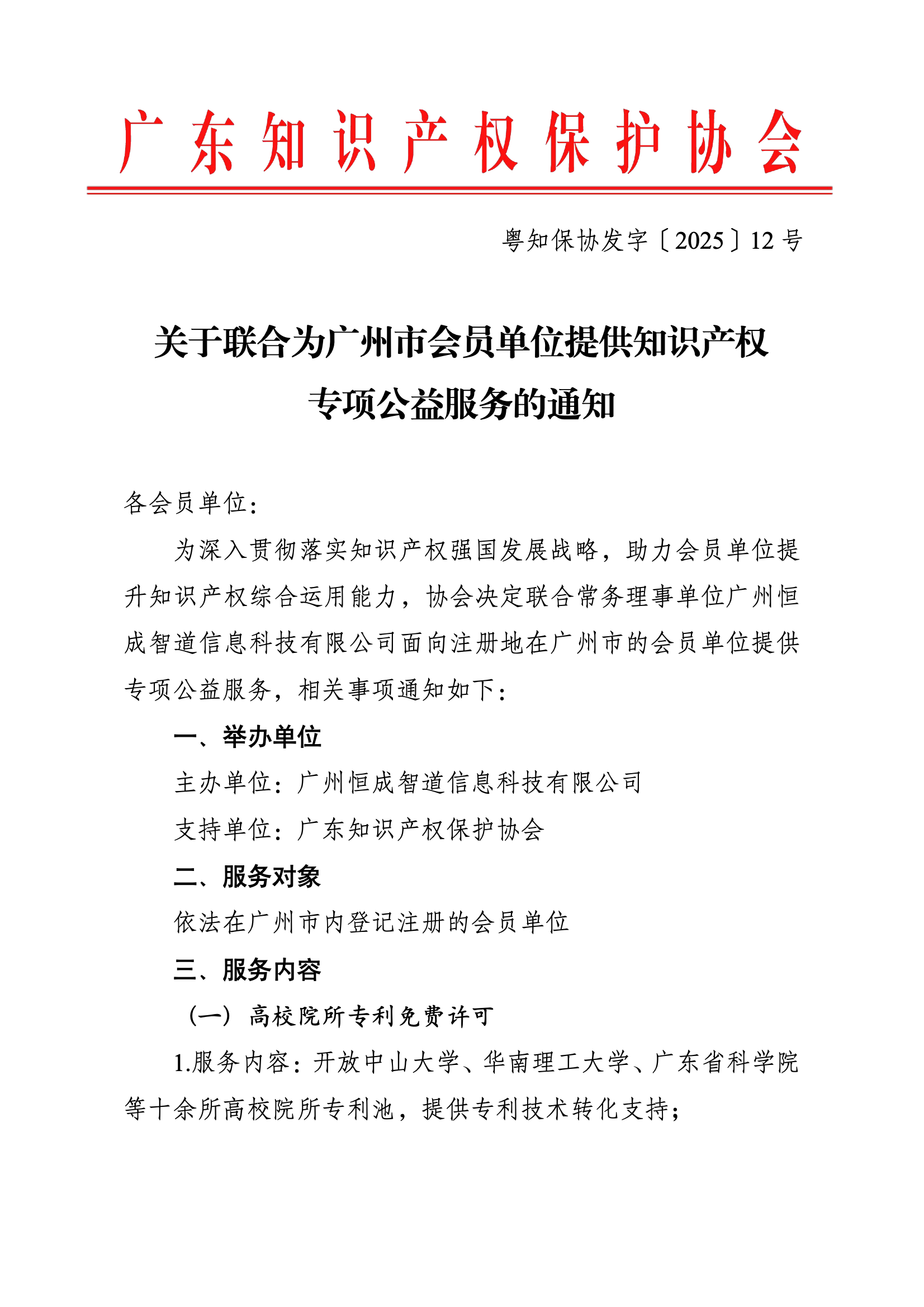 粤知保协发字〔2025〕12号-关于联合为广州市会员单位提供知识产权专项公益服务的通知