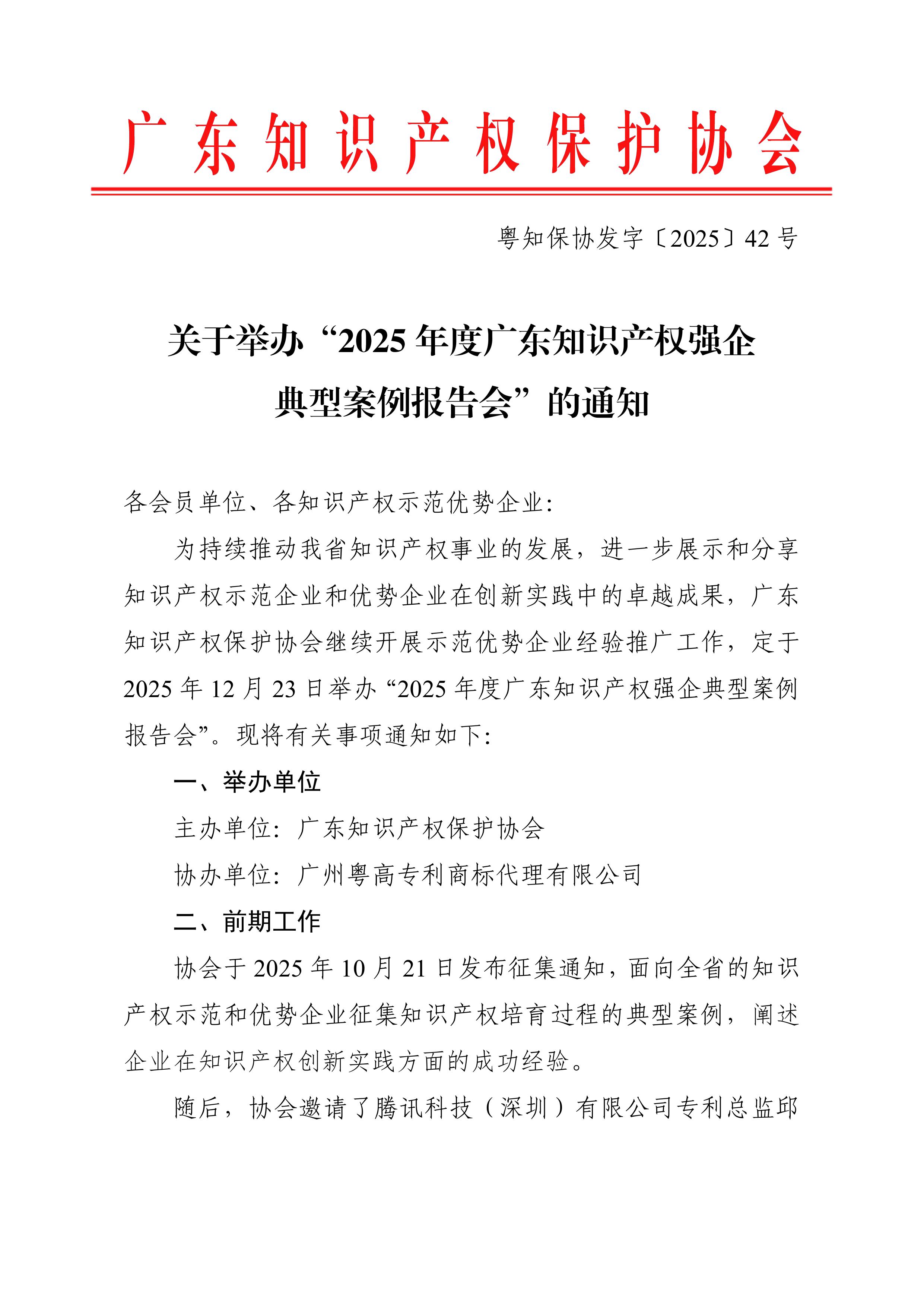 粤知保协发字〔2025〕42号-关于举办“2025年度广东知识产权强企典型案例报告会”的通知