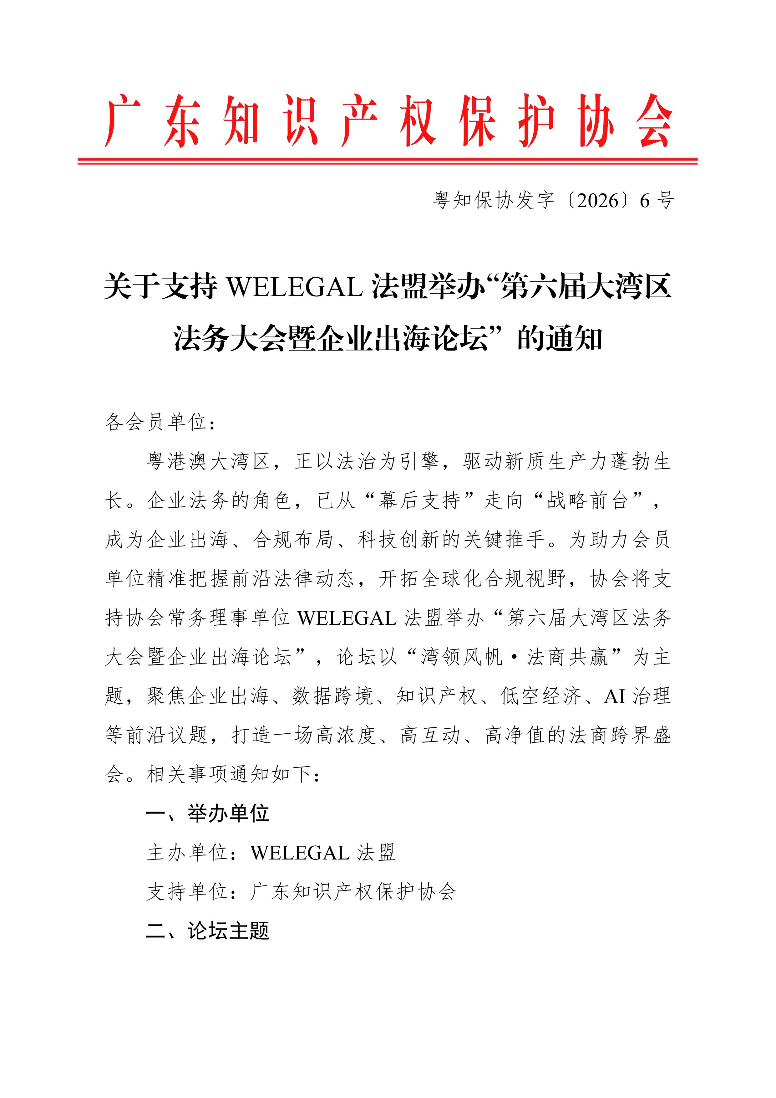 粤知保协发字〔2026〕6号-关于支持WELEGAL法盟举办“第六届大湾区法务大会暨企业出海论坛”的通知